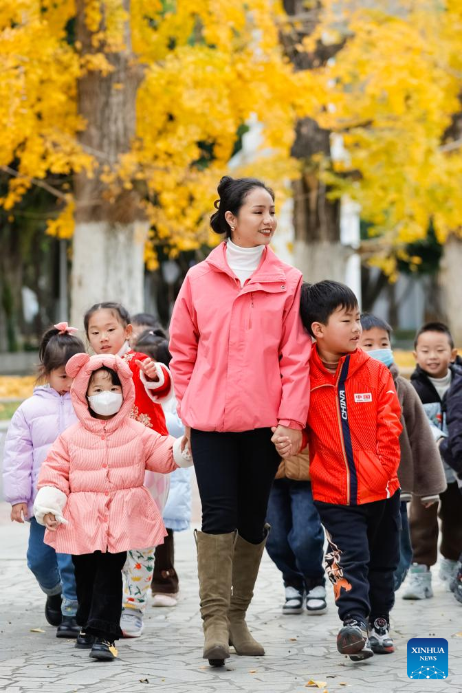 Yanggyi and kids take part in an outdoor activity in Chengdu, southwest China's Sichuan Province, Dec. 15, 2023. (Xinhua/Shen Bohan)