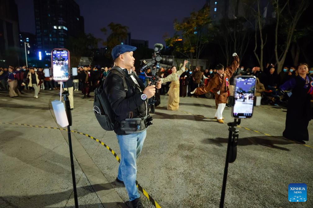 Yanggyi (R, front) dances Guozhuang with mobile phones livestreaming the scene at a square in Chengdu, southwest China's Sichuan Province, Dec. 23, 2023. (Xinhua/Shen Bohan)