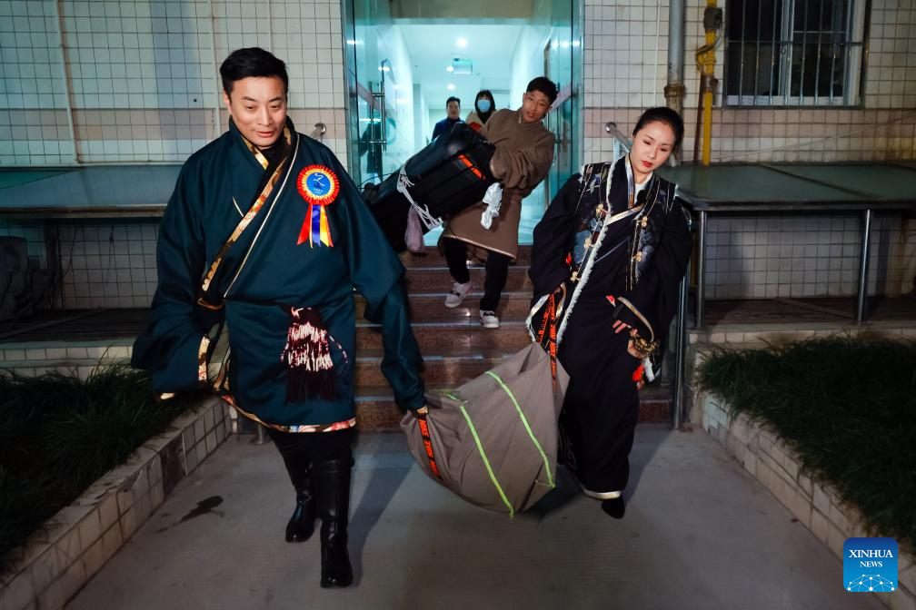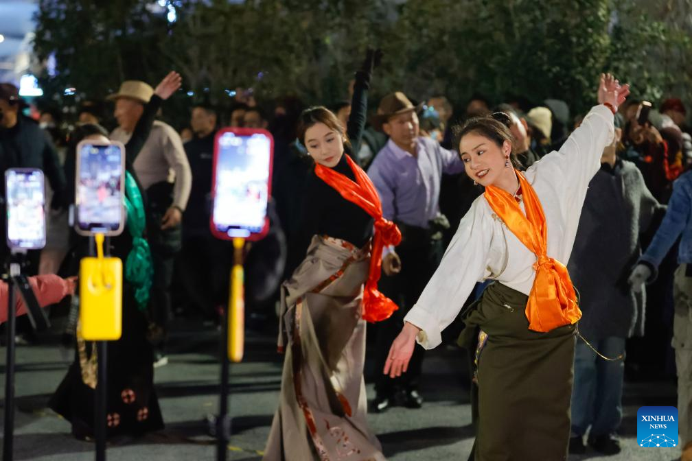 CHENGDU, Dec. 25 (Xinhua) -- At a public square in Chengdu, a bustling city of over 20 million people in southwestern China, 24-year-old Tibetan dancer Yanggyi, prepared for her performance, adjusting her traditional attire and the bun behind her head.