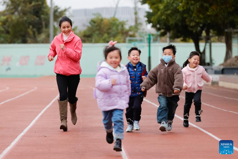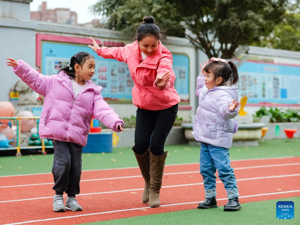 Yanggyi and kids play a game at a kindergarten in Chengdu, southwest China's Sichuan Province, Dec. 15, 2023. (Xinhua/Shen Bohan)
