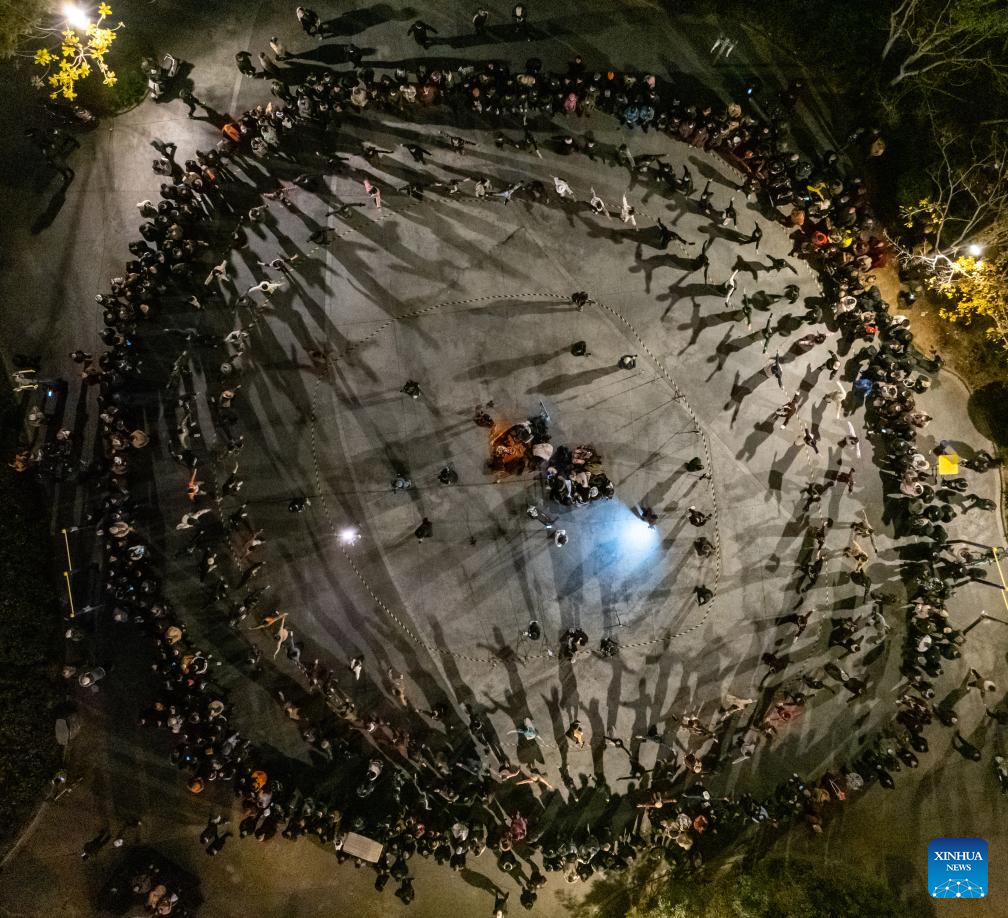 Dancers (front), who come from a Guozhuang dance troupe in Yushu Tibetan Autonomous Prefecture of Qinghai Province, dance with local dancers at a square in Chengdu, southwest China's Sichuan Province, Dec. 23, 2023. (Xinhua/Shen Bohan)