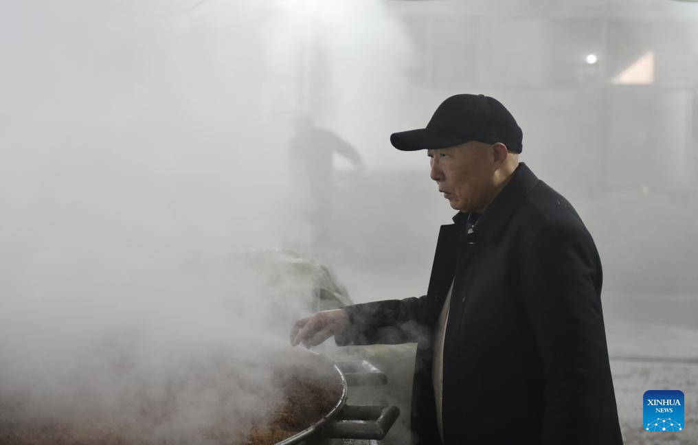 Lu Zhenying, an inheritor of intangible cultural heritage, checks the production at a workshop of Baofeng Baijiu Co., LTD in Baofeng County, central China's Henan Province, Dec. 21, 2023. (Xinhua/Lu Peng)