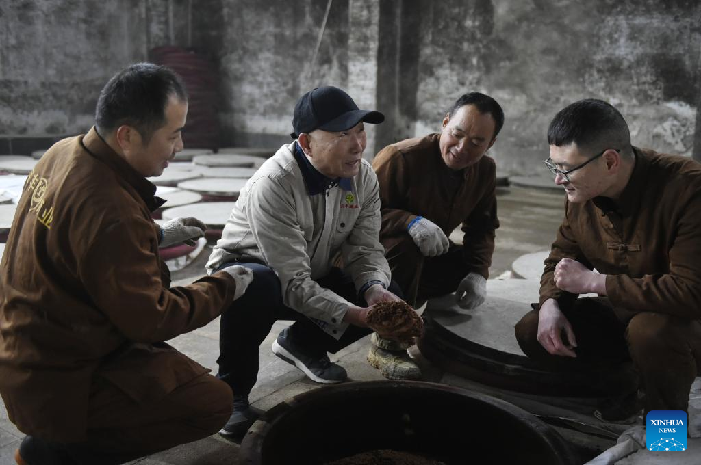 A worker checks the condition of distiller's yeast at a workshop of Baofeng Baijiu Co., LTD in Baofeng County, central China's Henan Province, Dec. 21, 2023. (Xinhua/Li An)