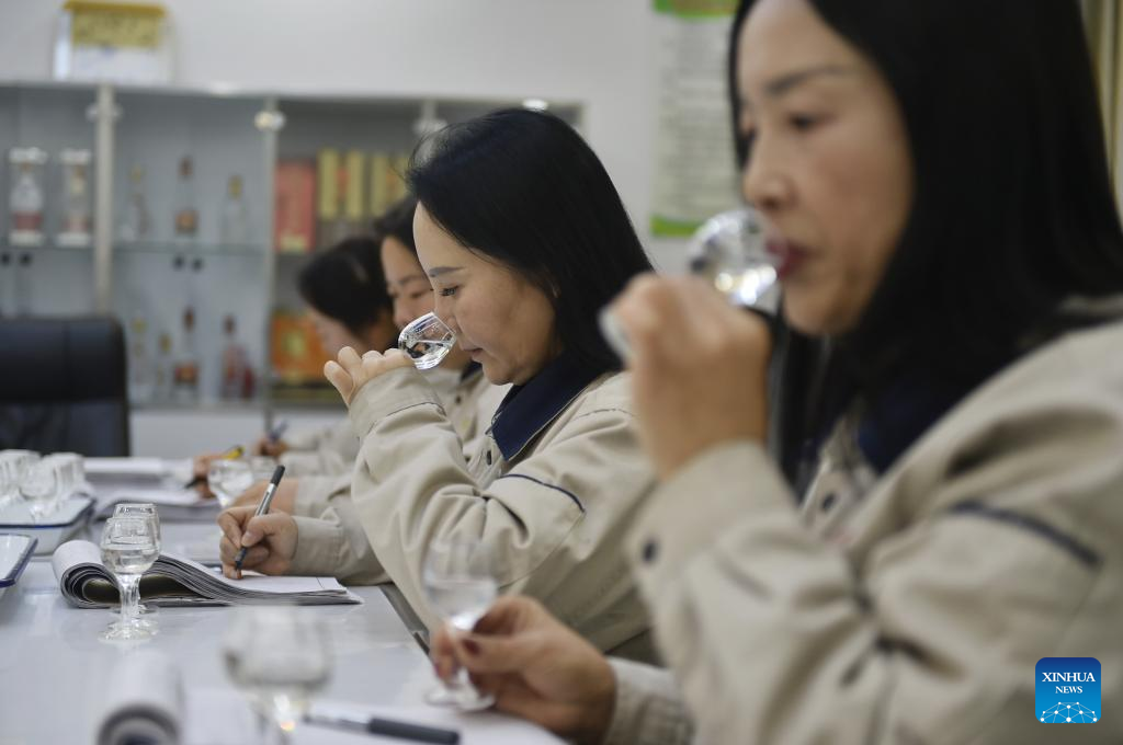 Technicians of Baofeng Baijiu Co., LTD evaluate the quality of distilled liquor in Baofeng County, central China's Henan Province, Dec. 21, 2023. (Xinhua/Lu Peng)