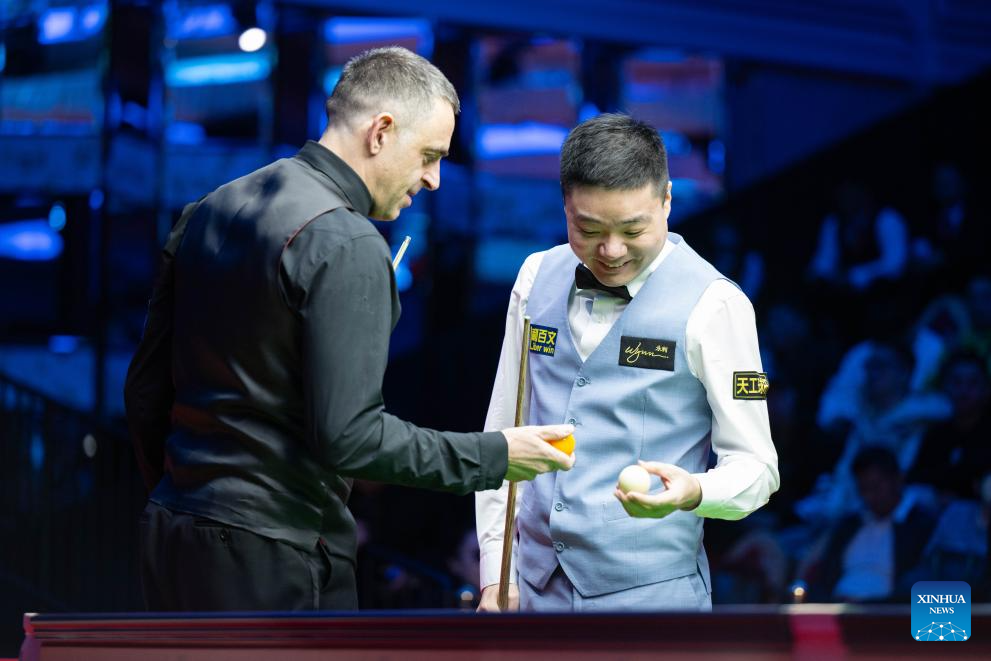 Ronnie O'Sullivan (L) and Ding Junhui talk before the exhibition game at the 2023 Macau Snooker Masters in Macau, south China, Dec. 25, 2023. (Xinhua/Cheong Kam Ka)