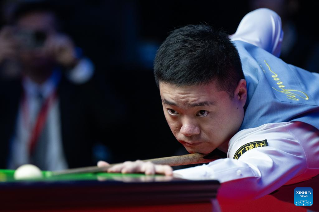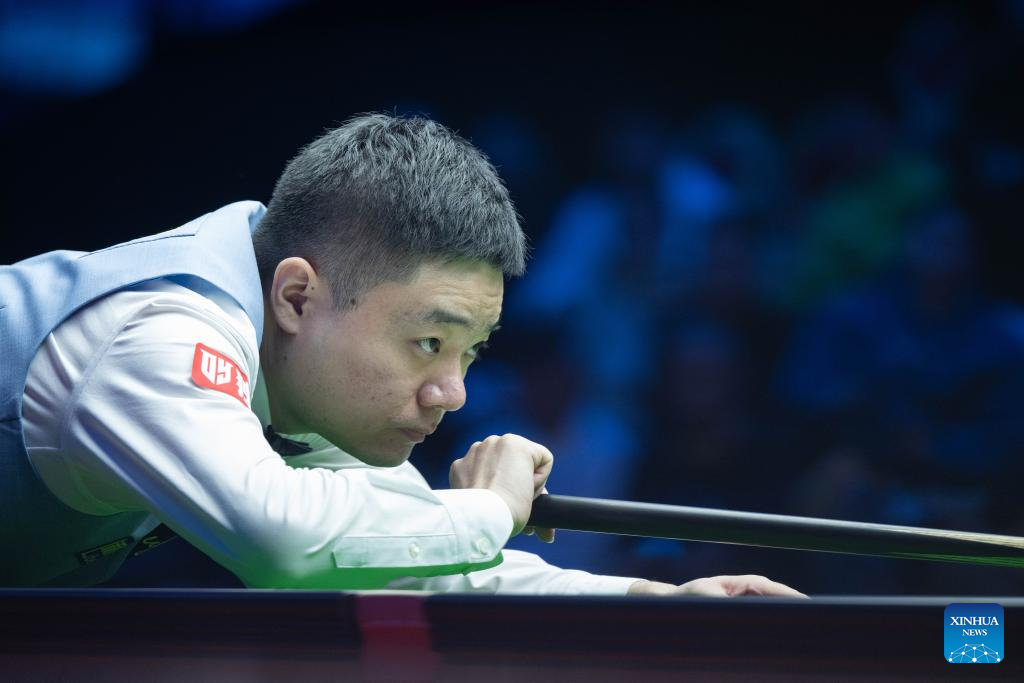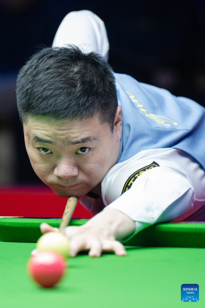 Ding Junhui of China competes during the exhibition game against Ronnie O'Sullivan of England at the 2023 Macau Snooker Masters in Macau, south China, Dec. 25, 2023. (Xinhua/Cheong Kam Ka)