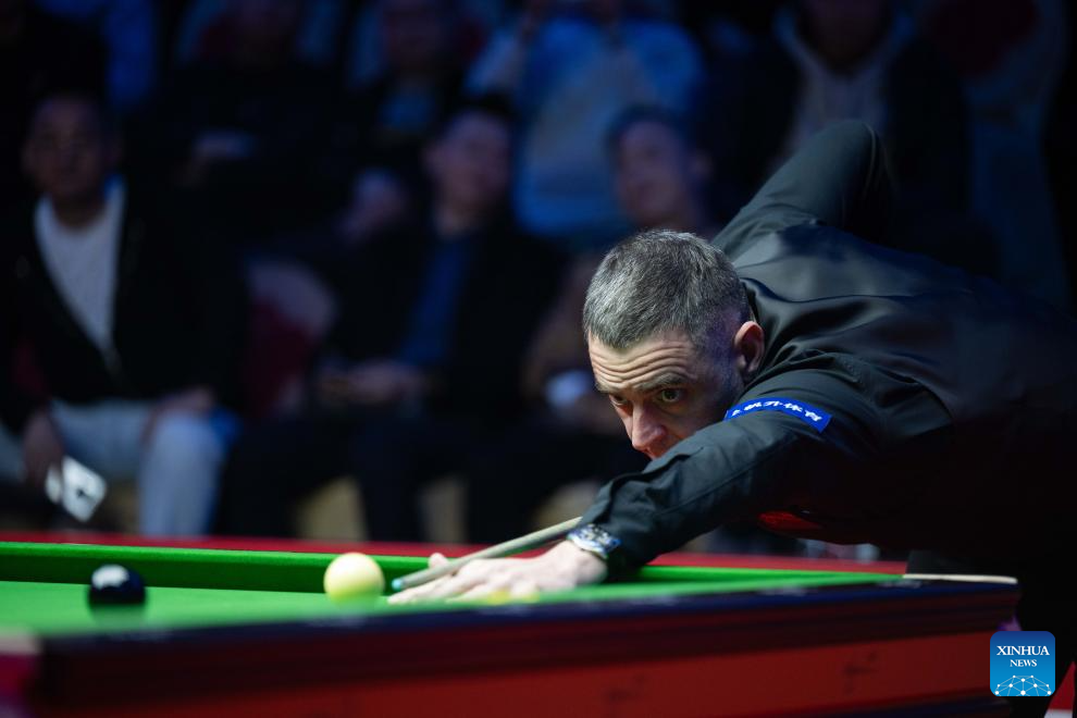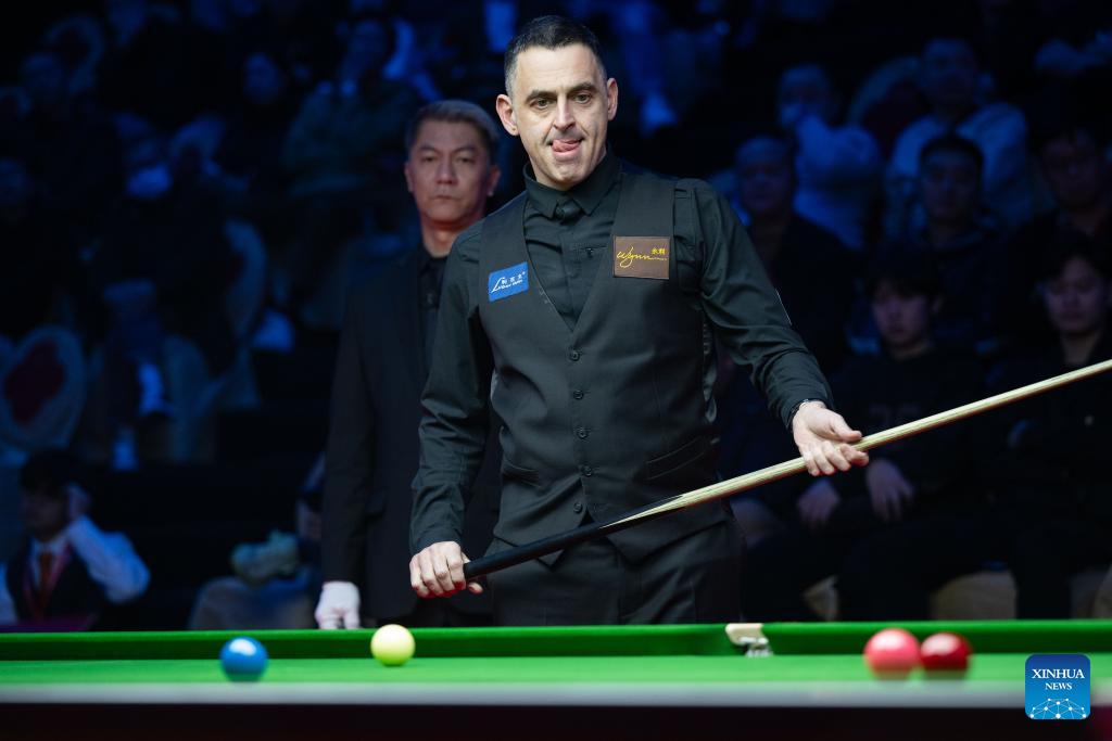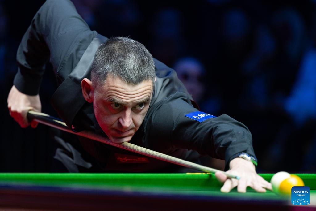 Ronnie O'Sullivan of England competes during the exhibition game against Ding Junhui of China at the 2023 Macau Snooker Masters in Macau, south China, Dec. 25, 2023. (Xinhua/Cheong Kam Ka)