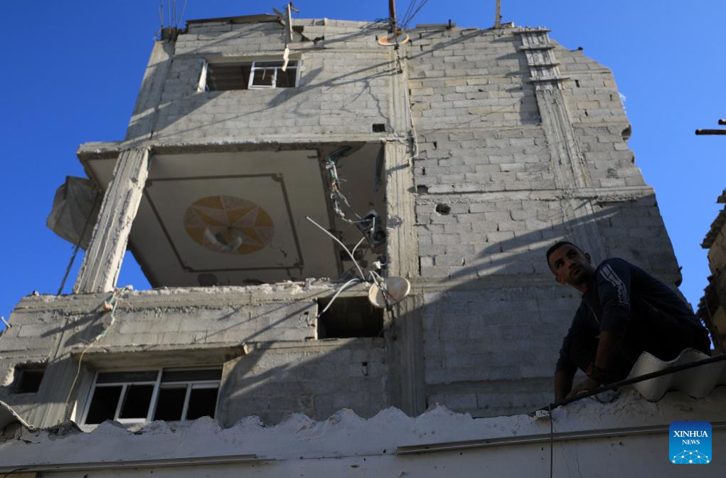 A man squats in front of a damaged building after an Israeli airstrike in the southern Gaza Strip city of Rafah, on Dec. 26, 2023. At least 20,915 Palestinians have been killed, and 54,918 others wounded in the Israel-Hamas conflict since Oct. 7, the Gaza-based Health Ministry said Tuesday. (Photo by Yasser Qudih/Xinhua)