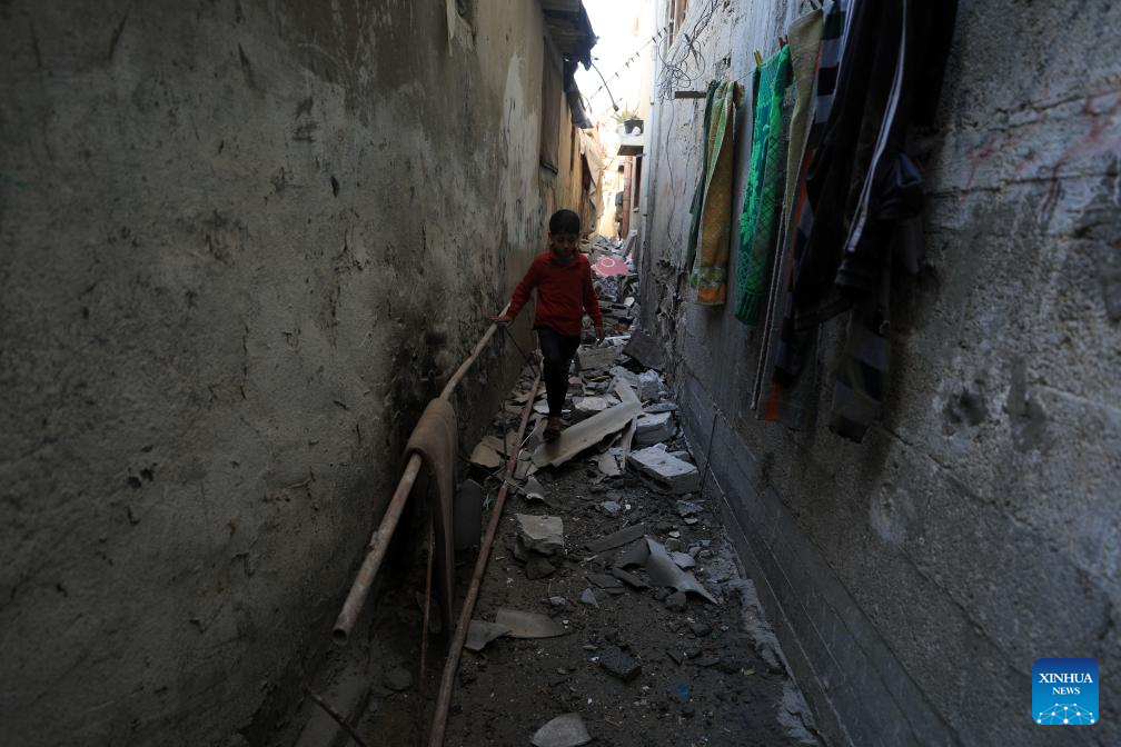 A boy walks among the rubble after an Israeli airstrike in the southern Gaza Strip city of Rafah, on Dec. 26, 2023. At least 20,915 Palestinians have been killed, and 54,918 others wounded in the Israel-Hamas conflict since Oct. 7, the Gaza-based Health Ministry said Tuesday. (Photo by Yasser Qudih/Xinhua)
