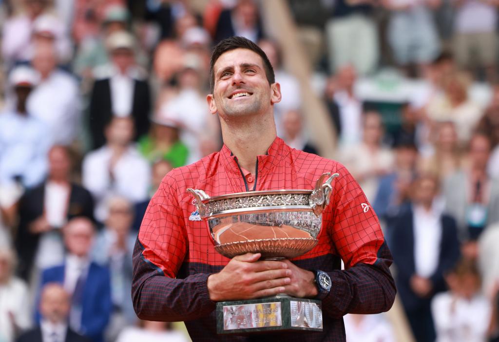 This file photo taken on June 11, 2023 shows Novak Djokovic of Serbia celebrating with his trophy after winning the men's singles final at the French Open tennis tournament at Roland Garros in Paris, France. (Xinhua/Gao Jing)