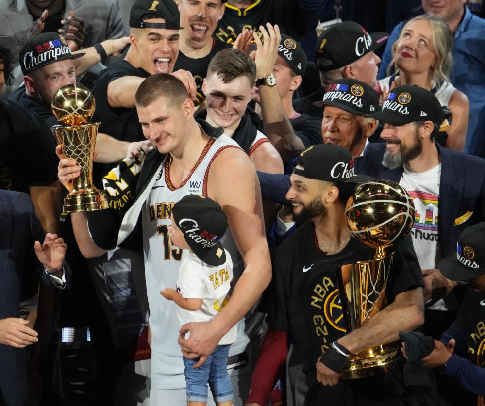 This file photo taken on June 12, 2023 shows Nikola Jokic (front L) of Denver Nuggets celebrating receiving the NBA Finals MVP Award after Denver Nuggets winning the 2023 NBA Finals against the Miami Heat at Ball Arena in Denver, the United States. (Xinhua/Wu Xiaoling)