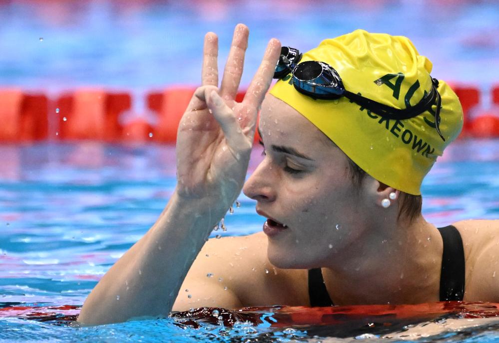 This file photo taken on July 29, 2023 shows Kaylee McKeown of Australia celebrating after winning the women's 200m backstroke final of swimming at the World Aquatics Championships in Fukuoka, Japan. (Xinhua/Xia Yifang)
