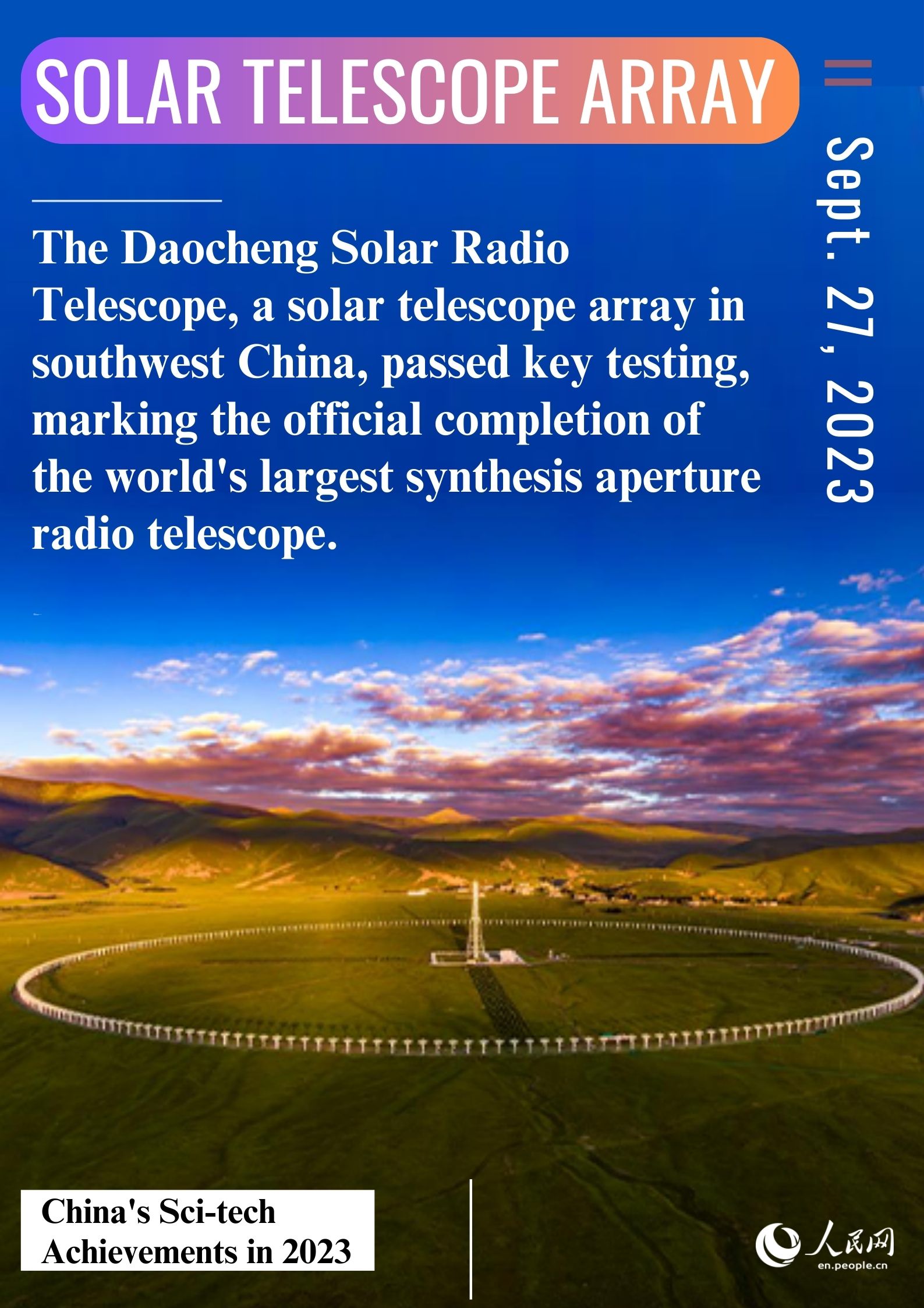 The Daocheng Solar Radio Telescope, a solar telescope array in southwest China, passed key testing on September 27, 2023, marking the official completion of the world's largest synthesis aperture radio telescope.