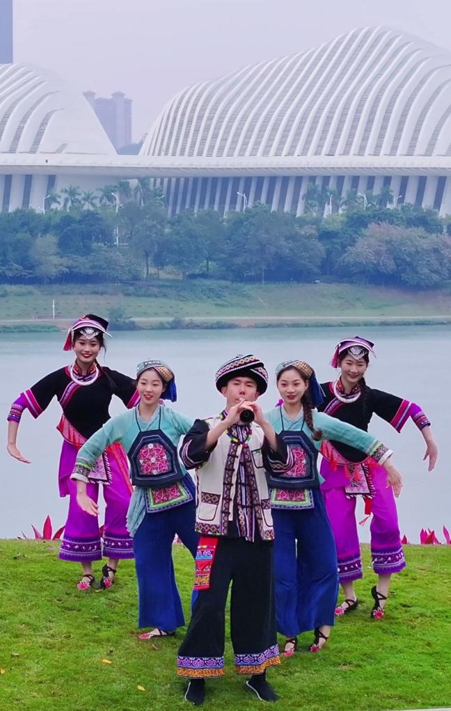 This screenshot captured from a video shows people performing "Kemusan" dance with traditional musical instruments of the Zhuang ethnic group in Nanning, south China's Guangxi Zhuang Autonomous Region, in December 2023. (Xinhua)