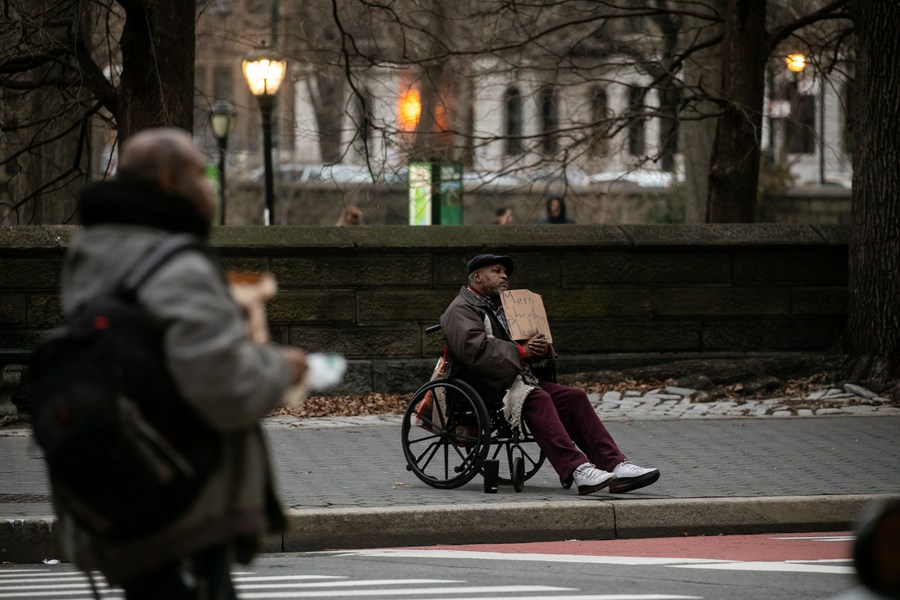 A man in a wheelchair holds a cardboard and begs for help in New York, the United States, on Dec. 24, 2023. (Photo by Michael Nagle/Xinhua)
