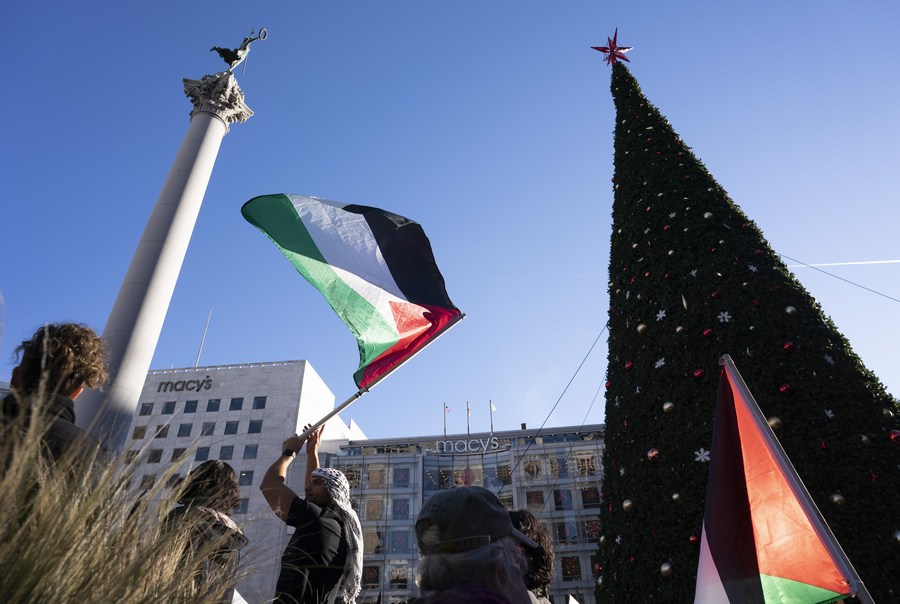 People rally to support Palestinians and protest against Israel's blockade of the Gaza Strip, at the Union Square in San Francisco, California, the United States, Dec. 23, 2023. (Photo by Li Jianguo/Xinhua)