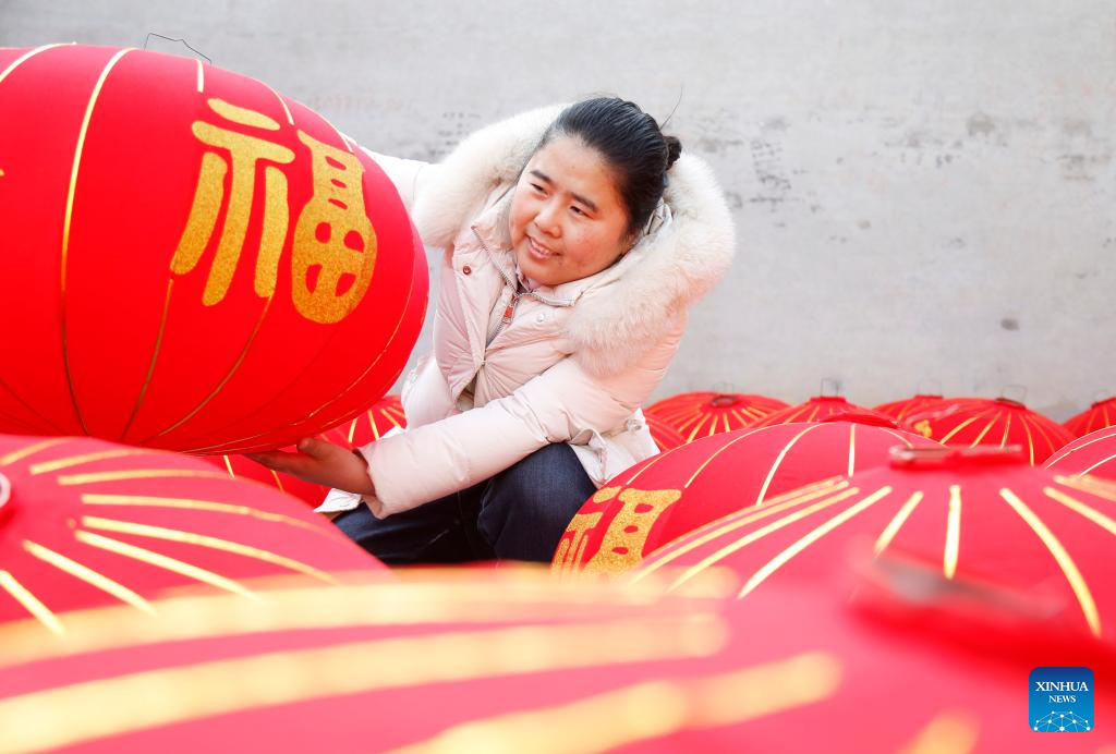 A worker checks a finished lantern at a workshop in Dongshanzhao Township of Xingtai City, north China's Hebei Province, Dec. 27, 2023. As the new year approaches, lantern workshops increased the capacity of production in Xingtai City of Hebei Province to meet the market demand. (Photo by Zhang Chi/Xinhua)
