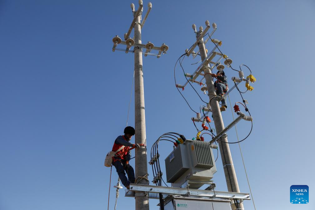 Employees of the State Grid work at a temporary settlement site in Chuimatan Town of Jishishan, northwest China's Gansu Province, Dec. 27, 2023. (Xinhua/Fang Xin)