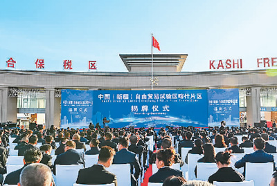 A photo taken Nov. 11, 2023, shows the unveiling ceremony of the Kashgar Area of the China (Xinjiang) Pilot Free Trade Zone in Kashgar, northwest China's Xinjiang Uygur Autonomous Region. (Xinhua/Ding Lei)