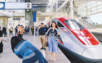 Passengers pose for photos with a high-speed electrical multiple unit (EMU) train at the platform of Tegalluar Station on the Jakarta-Bandung High-Speed Railway in Bandung, Indonesia. The railway, jointly built by China and Indonesia, officially began commercial operation Oct. 17, 2023. (Xinhua/Xu Qin)