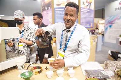 An exhibitor presents Ethiopian coffee during the third China-Africa Economic and Trade Expo in Changsha, central China's Hunan Province. (Xinhua/Sun Ruibo)