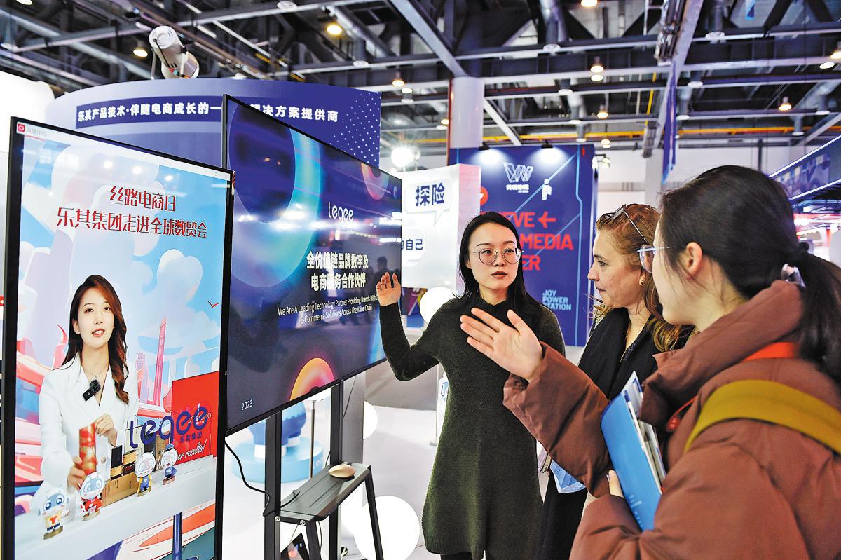 Exhibitors introduce livestream promotions to visitors during an e-commerce expo in Hangzhou, Zhejiang province. LIU LINGYI/XINHUA