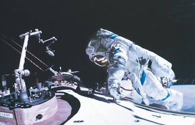 This photo taken at the Beijing Aerospace Control Center on Dec. 21, 2023 shows Shenzhou-17 astronaut Tang Shengjie performing extravehicular activities. (Photo/Han Qiyang)