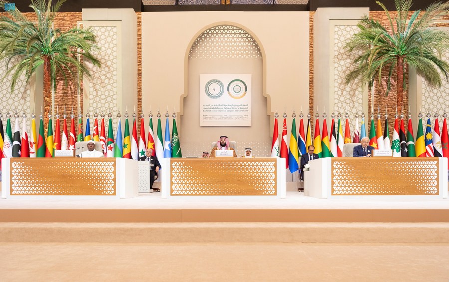 Saudi Crown Prince and Prime Minister Mohammed bin Salman Al Saud (C) speaks during the Joint Arab Islamic Extraordinary Summit in Riyadh, Saudi Arabia, Nov. 11, 2023. The Joint Arab Islamic Extraordinary Summit held in the Saudi capital of Riyadh called for an immediate cessation of military operations in Gaza. (SPA/Handout via Xinhua)
