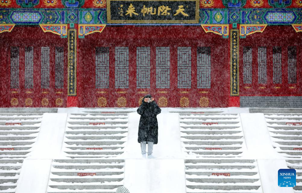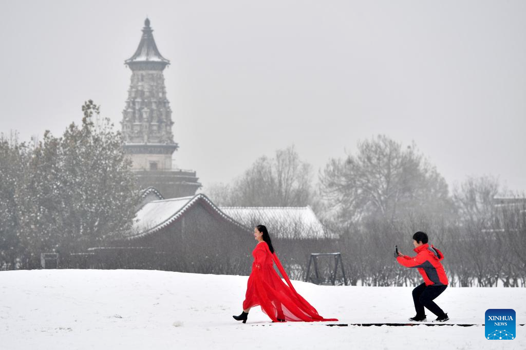 Tourists take pictures in snow-covered Zhengding ancient town in Shijiazhuang, north China's Hebei Province, Dec. 13, 2023. A rendezvous with snow refreshes the landscapes as winter leaves its steps in most parts of China. (Photo by Zhang Xiaofeng/Xinhua)