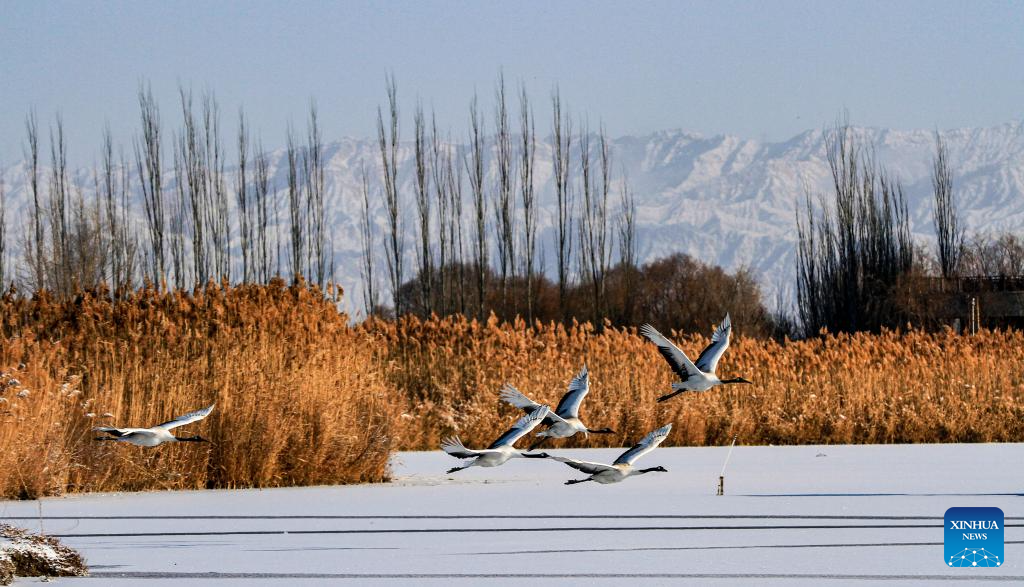 Red-crowned cranes fly at a national wetland park in Zhangye, northwest China's Gansu Province, Dec. 15, 2023. A rendezvous with snow refreshes the landscapes as winter leaves its steps in most parts of China. (Photo by Chen Li/Xinhua)