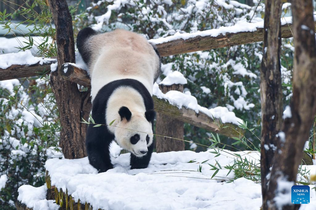 A giant panda has fun in the snow at Hongshan Forest Zoo in Nanjing, capital city of east China's Jiangsu Province, Dec. 19, 2023. A rendezvous with snow refreshes the landscapes as winter leaves its steps in most parts of China. (Photo by Fang Dongxu/Xinhua)