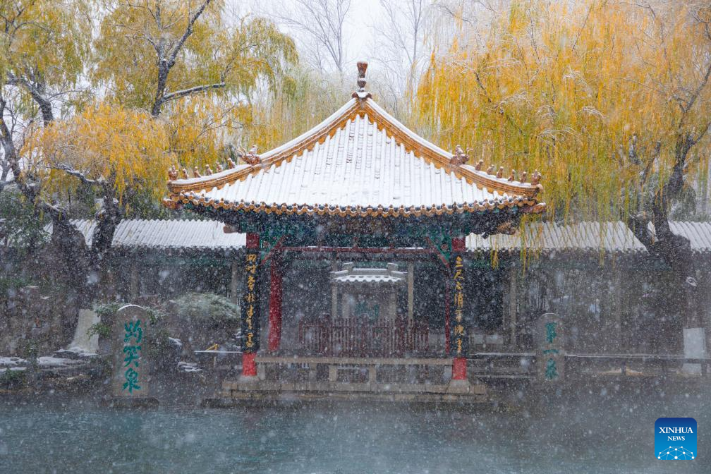 This photo taken on Dec. 14, 2023 shows a view of the Baotu Spring in Jinan, capital city of east China's Shandong Province. A rendezvous with snow refreshes the landscapes as winter leaves its steps in most parts of China. (Photo by Xu Zhou/Xinhua)