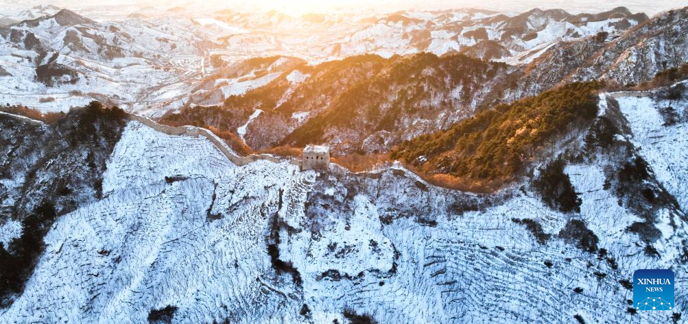 This aerial photo taken on Dec. 16, 2023 shows a section of the Great Wall after snow in Zunhua, north China's Hebei Province. A rendezvous with snow refreshes the landscapes as winter leaves its steps in most parts of China. (Photo by Liu Mancang/Xinhua)