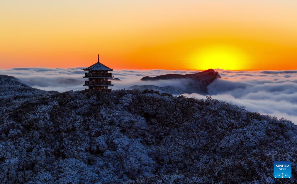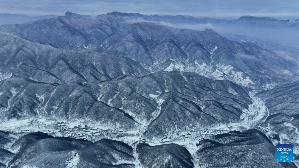This aerial photo taken on Dec. 12, 2023 shows scenery of the Wangwu Mountain scenic spot in Jiyuan City, central China's Henan Province. A rendezvous with snow refreshes the landscapes as winter leaves its steps in most parts of China. (Photo by Duan Erping/Xinhua)
