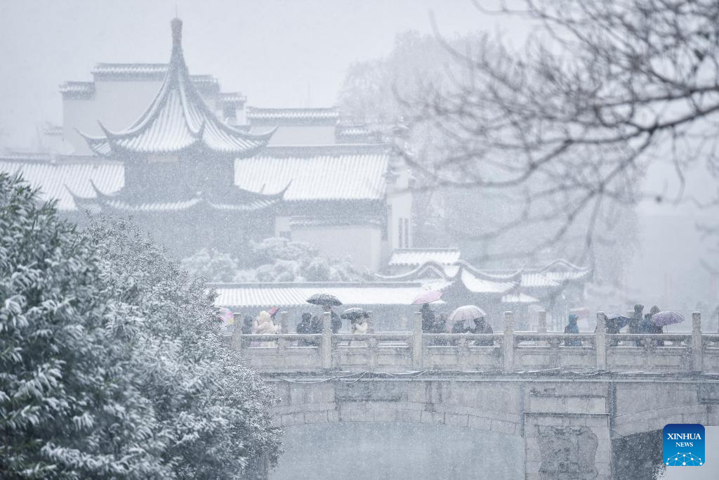 People visit the Fuzi (Confucius) Temple scenic area in Nanjing, east China's Jiangsu Province, Dec. 18, 2023. A rendezvous with snow refreshes the landscapes as winter leaves its steps in most parts of China. (Photo by Fang Dongxu/Xinhua)