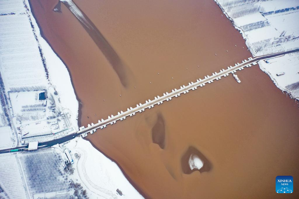 This aerial photo taken on Dec. 15, 2023 shows a section of the Yellow River in Taizi Township of Zouping, capital of east China's Shandong Province. A rendezvous with snow refreshes the landscapes as winter leaves its steps in most parts of China. (Photo by Dong Naide/Xinhua)