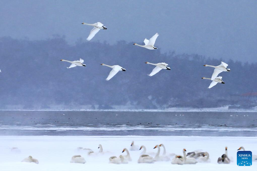 Whooper swans are pictured at a reserve in Rongcheng, east China's Shandong Province, Dec. 16, 2023. A rendezvous with snow refreshes the landscapes as winter leaves its steps in most parts of China. (Photo by Wang Fudong/Xinhua)