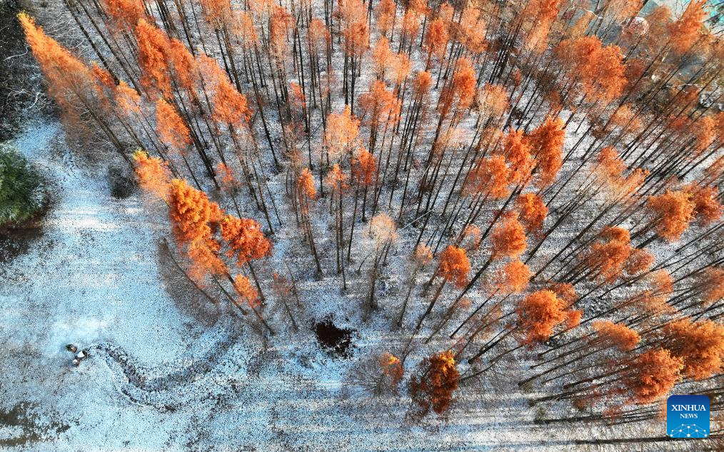 This aerial photo taken on Dec. 16, 2023 shows the scenery of the Zhuyuwan Park in Yangzhou, east China's Jiangsu Province. A rendezvous with snow refreshes the landscapes as winter leaves its steps in most parts of China. (Photo by Meng Delong/Xinhua)
