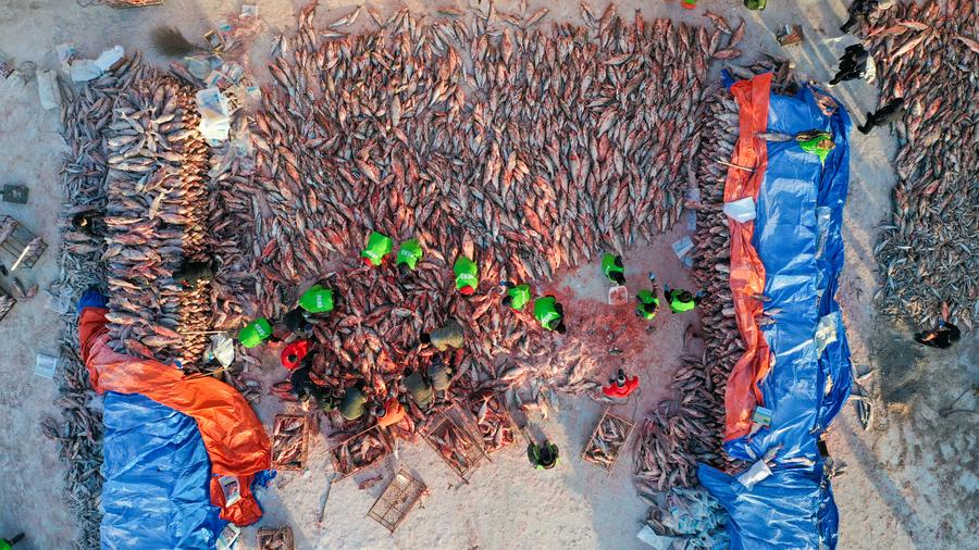 Fishes are seen during a winter fishing-themed festival on the Chagan Lake in Songyuan City, northeast China's Jilin Province, Dec. 28, 2023. (Xinhua/Zhang Nan)