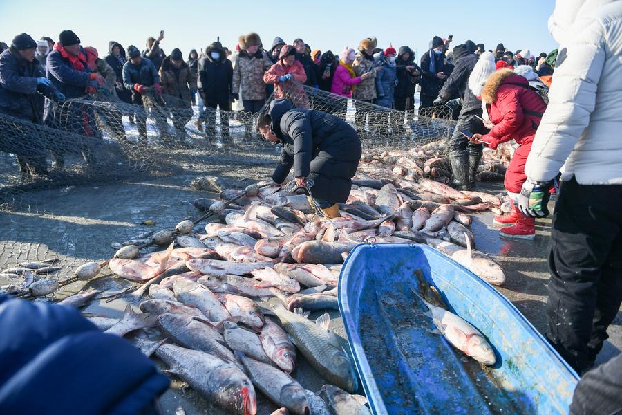 Chagan Lake, located in Songyuan City of northeast China's Jilin Province, is one of China's largest freshwater lakes with abundant fishery resources. Locals living by Chagan Lake have kept alive the tradition of ice fishing by hand-drilling holes through the thick ice and casting nets into the icy waters to catch fish.