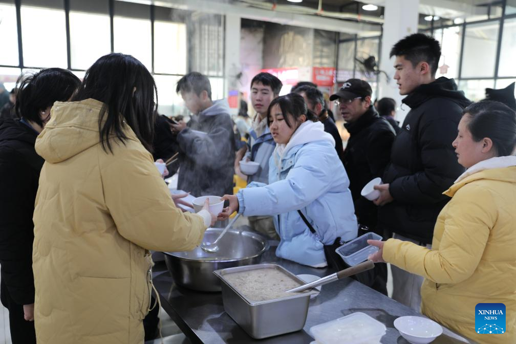 People line up to take free fish dish at the Hunan University of Arts and Science in Changde, central China's Hunan Province, Dec. 25, 2023. (Photo by Cai Wenlong/Xinhua)