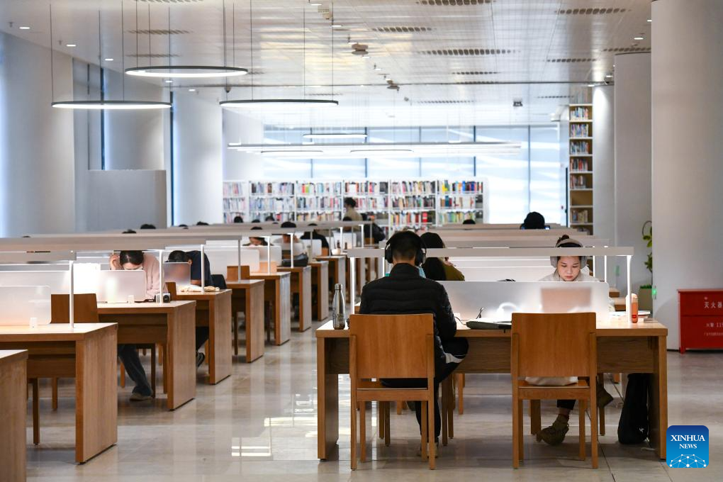 People read at the north hall of Shenzhen Library in Shenzhen, south China's Guangdong Province, Dec. 28, 2023. Located in Longhua District of the city, the north hall of Shenzhen Library officially opened on Thursday. With a building area of about 72,000 square meters, the hall is designed to stock 8 million books and provides 2,500 seats. (Xinhua/Liang Xu)