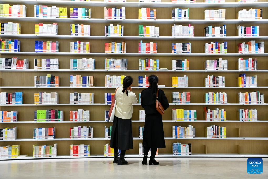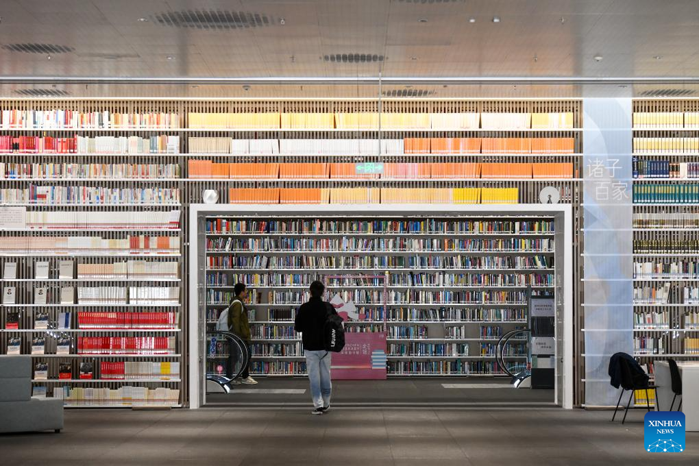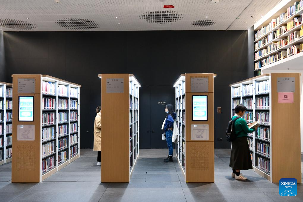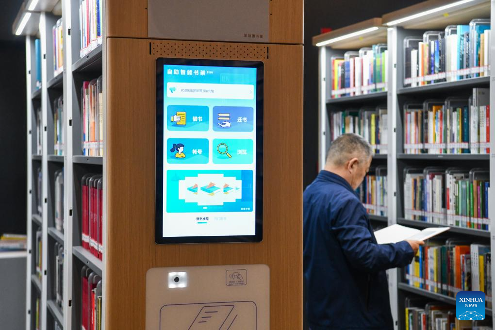 This photo taken on Dec. 28, 2023 shows a self-service smart bookshelf at the north hall of Shenzhen Library in Shenzhen, south China's Guangdong Province. Located in Longhua District of the city, the north hall of Shenzhen Library officially opened on Thursday. With a building area of about 72,000 square meters, the hall is designed to stock 8 million books and provides 2,500 seats. (Xinhua/Liang Xu)