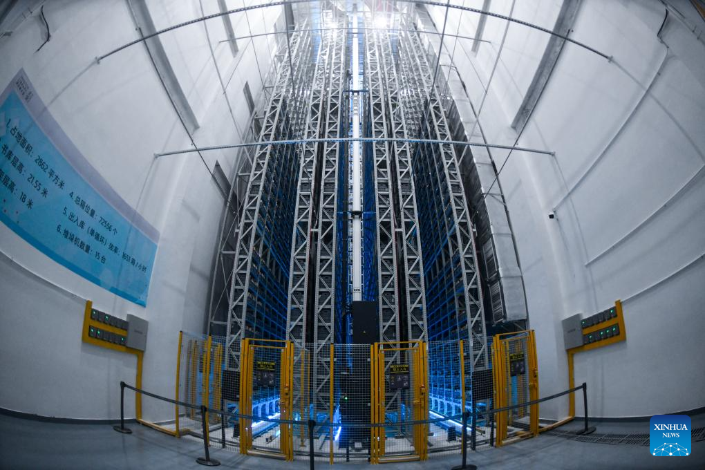 This photo taken on Dec. 28, 2023 shows an intelligent stereo book stack at the north hall of Shenzhen Library in Shenzhen, south China's Guangdong Province. Located in Longhua District of the city, the north hall of Shenzhen Library officially opened on Thursday. With a building area of about 72,000 square meters, the hall is designed to stock 8 million books and provides 2,500 seats. (Xinhua/Liang Xu)