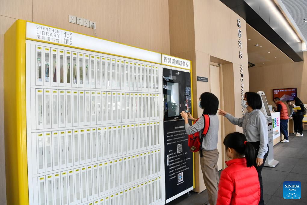 People borrow books at a smart bookcase at the north hall of Shenzhen Library in Shenzhen, south China's Guangdong Province, Dec. 28, 2023. Located in Longhua District of the city, the north hall of Shenzhen Library officially opened on Thursday. With a building area of about 72,000 square meters, the hall is designed to stock 8 million books and provides 2,500 seats. (Xinhua/Liang Xu)