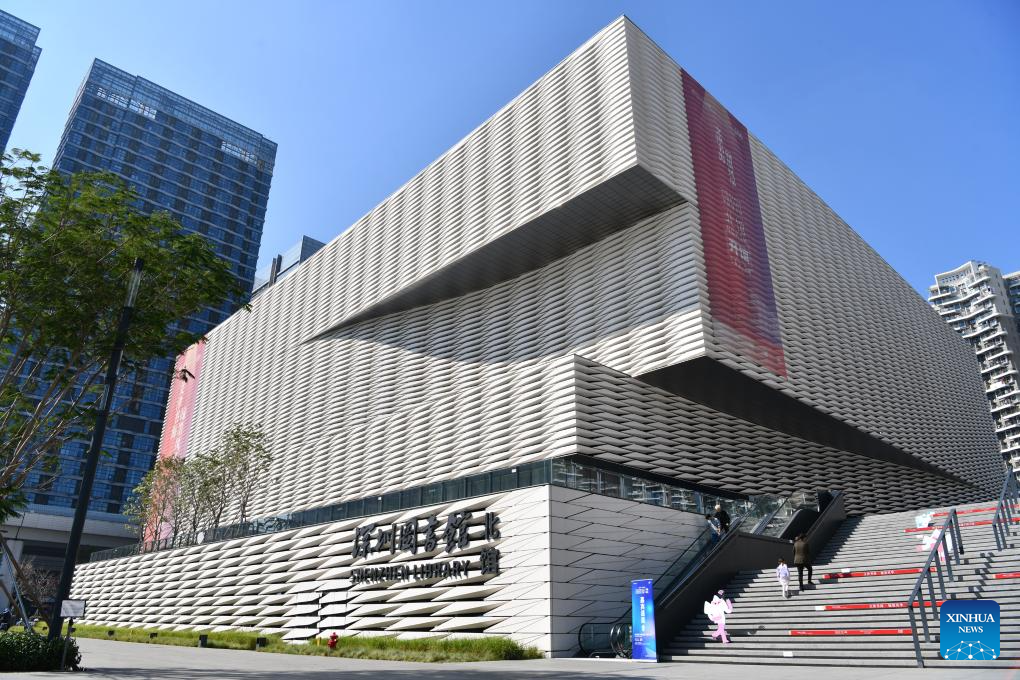 People visit the north hall of Shenzhen Library in Shenzhen, south China's Guangdong Province, Dec. 28, 2023. Located in Longhua District of the city, the north hall of Shenzhen Library officially opened on Thursday. With a building area of about 72,000 square meters, the hall is designed to stock 8 million books and provides 2,500 seats. (Xinhua/Liang Xu)