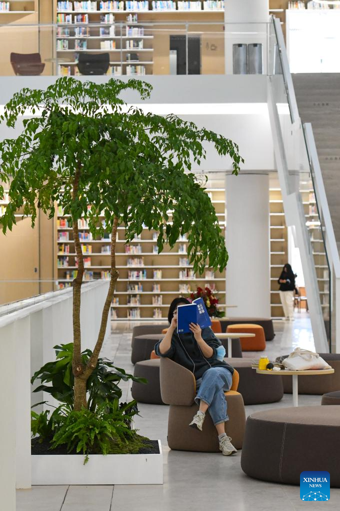 A woman reads at the north hall of Shenzhen Library in Shenzhen, south China's Guangdong Province, Dec. 28, 2023. Located in Longhua District of the city, the north hall of Shenzhen Library officially opened on Thursday. With a building area of about 72,000 square meters, the hall is designed to stock 8 million books and provides 2,500 seats. (Xinhua/Liang Xu)