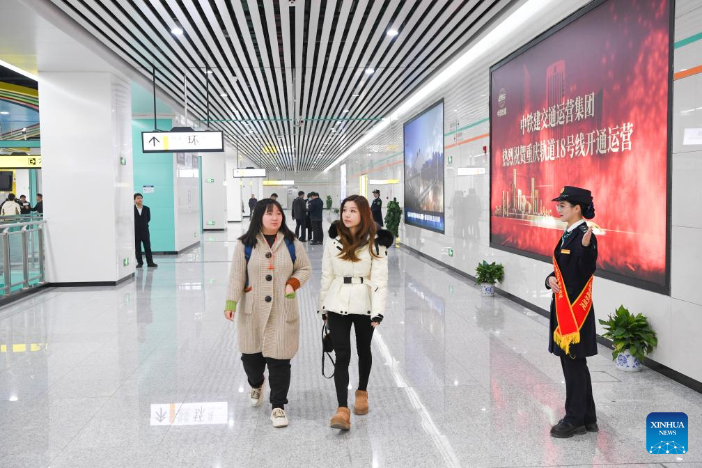 Passengers take Chongqing Rail Transit Line 18 in southwest China's Chongqing Municipality, Dec. 28, 2023. Chongqing Rail Transit (CRT) Line 18, which is 29 kilometers long and has 19 stations, officially started initial operation on Thursday. So far, a total of 13 rail transit lines are in operation in the city with an operating length reaching 538 kilometers. (Xinhua/Wang Quanchao)