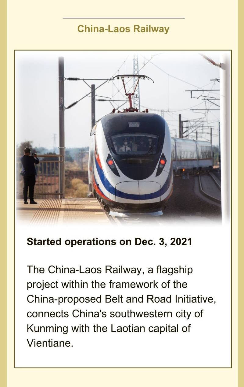 The China-Laos Railway, a flagship project within the framework of the China-proposed Belt and Road Initiative, connects China's southwestern city of Kunming with the Laotian capital of Vientiane.