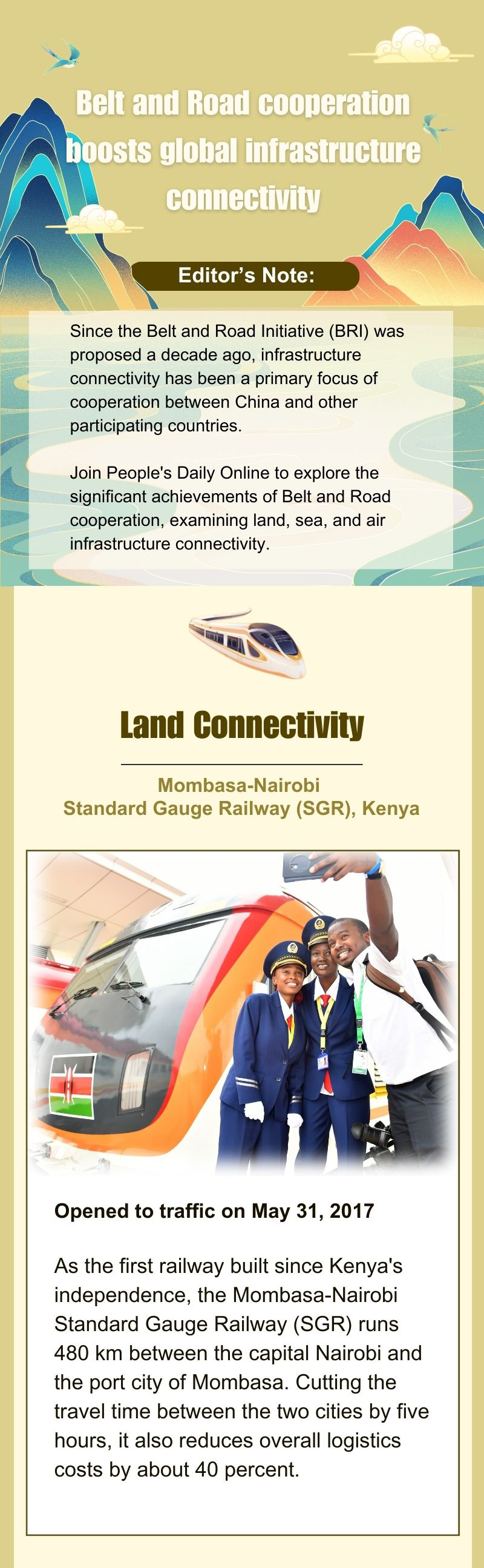 As the first railway built since Kenya's independence, the Mombasa-Nairobi Standard Gauge Railway (SGR) runs 480 km between the capital Nairobi and the port city of Mombasa. Cutting the travel time between the two cities by five hours, it also reduces overall logistics costs by about 40 percent.